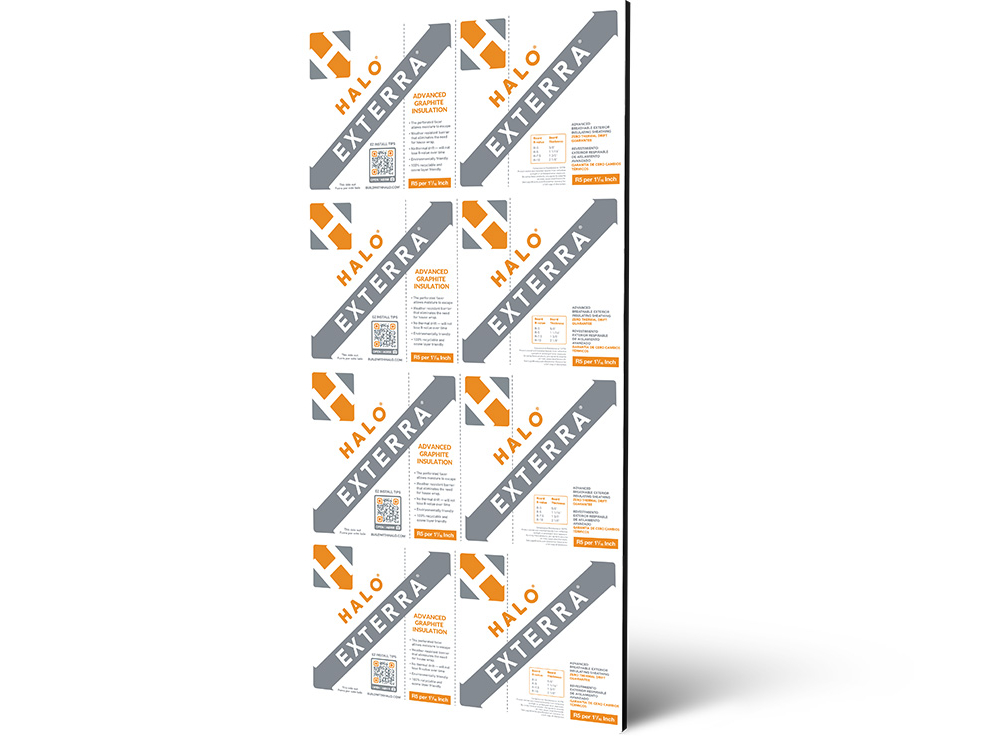 Halo® Exterra® is a high-performance, breathable, and continuous insulation product designed for exterior applications. Insulation specifications continue to change. Exterra R5 per nominal inch GPS core, laminated with an intuitive perforated film, allows vapor to escape and keeps walls dry and healthy to help you meet code. Exterra is lightweight, durable, and easy to cut and install. It also functions as a weather-resistant barrier (WRB) when taped, making this 2-in-1 insulation board cost-effective not only in terms of materials but also labor.